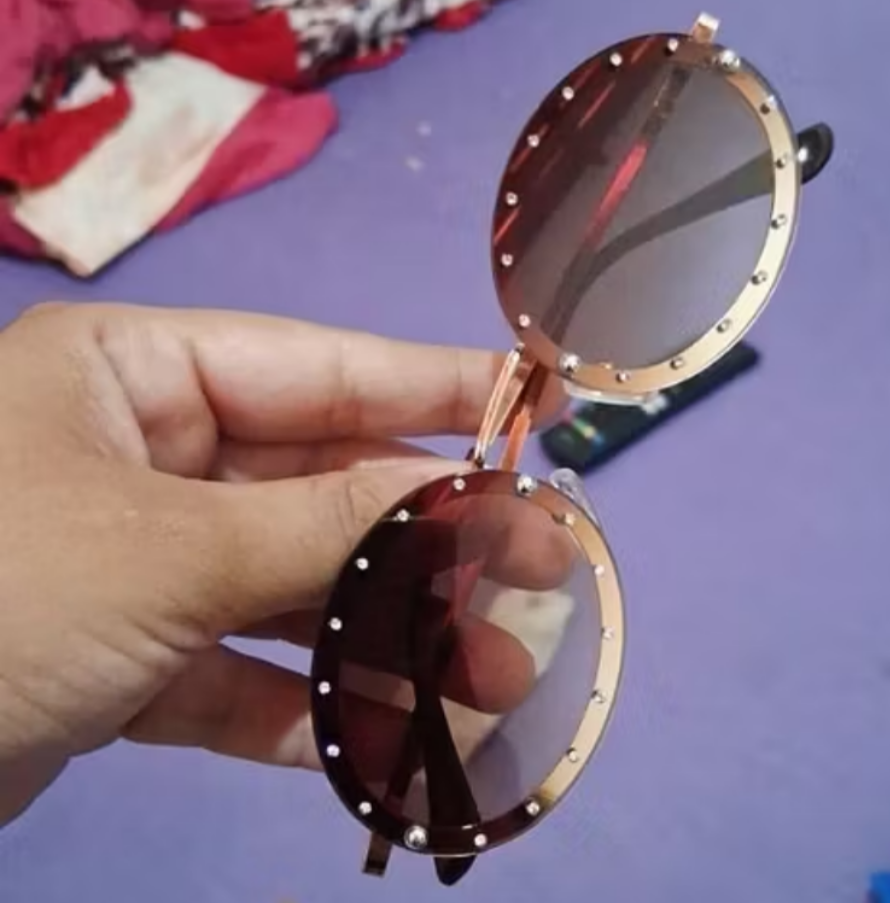 Óculos redondo com pedrarias marrom, contém proteção solar UV 400